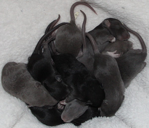 Expecting: English Irish, Irish and Berkshire. Black in color, with a chance of others (including Burmese and Silver Blue) depending on what the parents carry. 100% dumbo ears and 50% rex.
